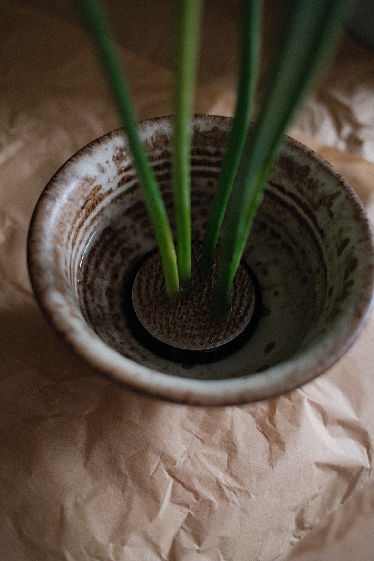 If your vessel of choice is fragile, leaky or just very large, adding an internal, hidden vessel will provide a secure water source. This may be another vase you have that can fit inside or a recycled plastic pot that can easily be cut or trimmed to be placed discreetly inside.